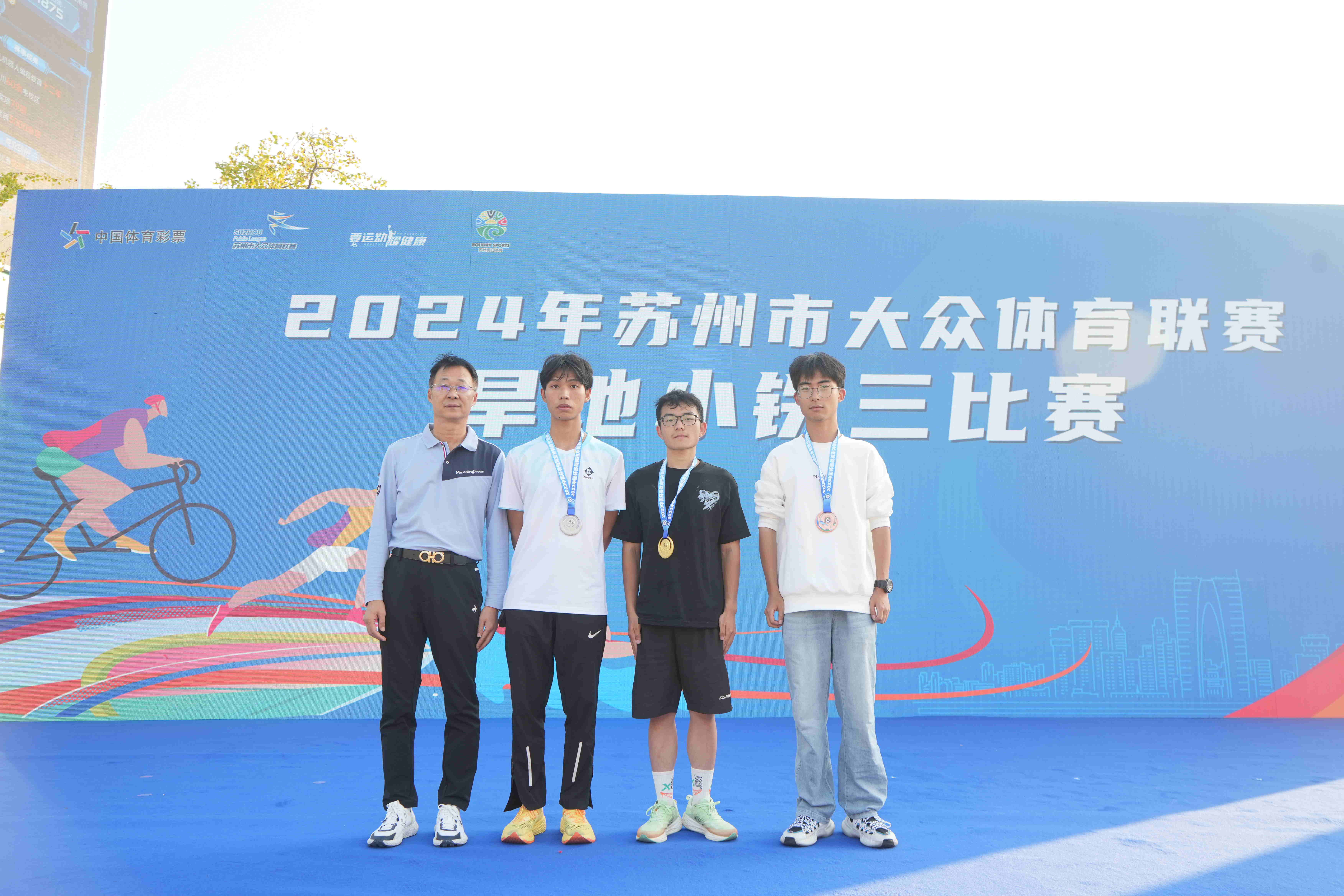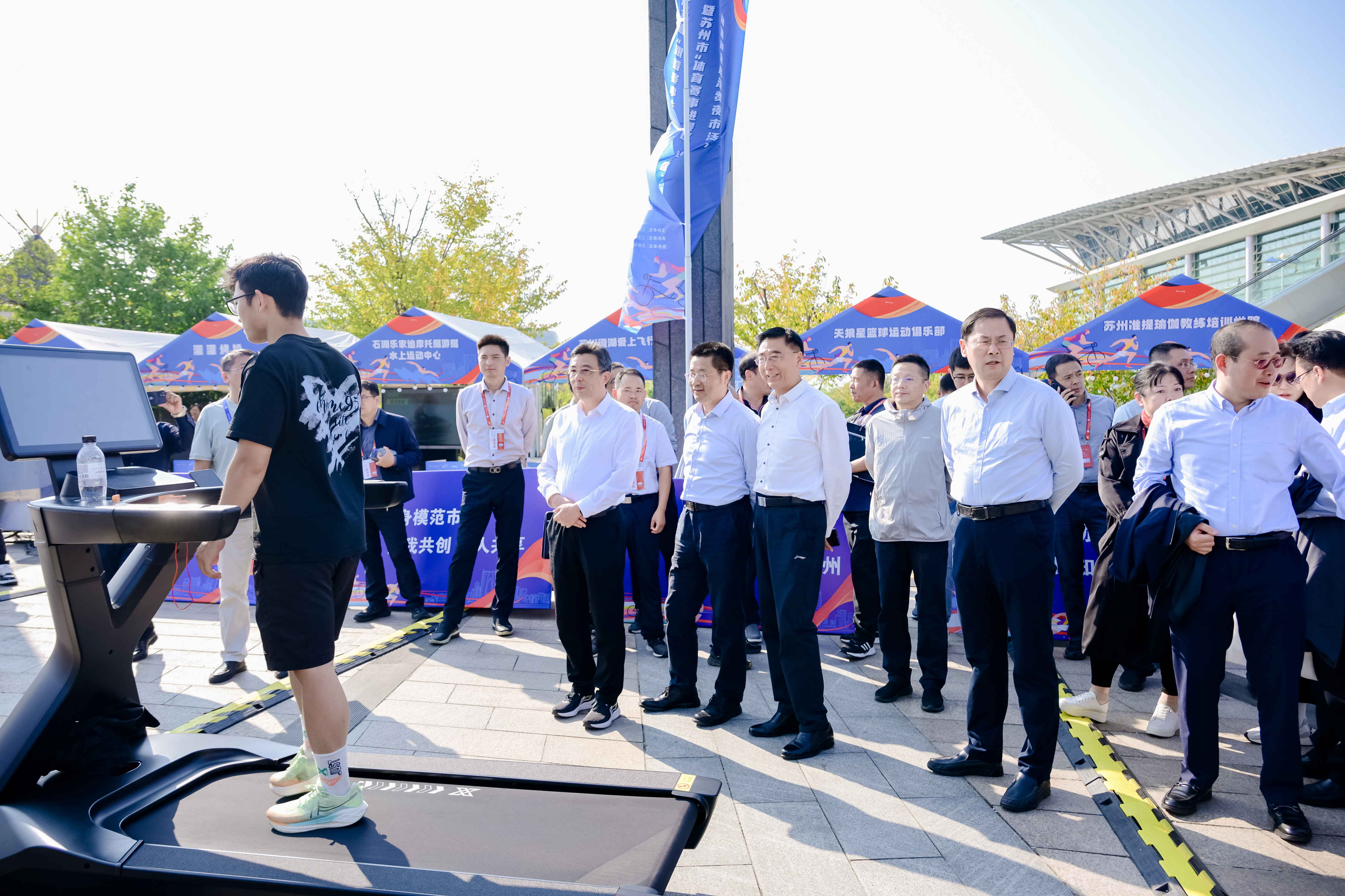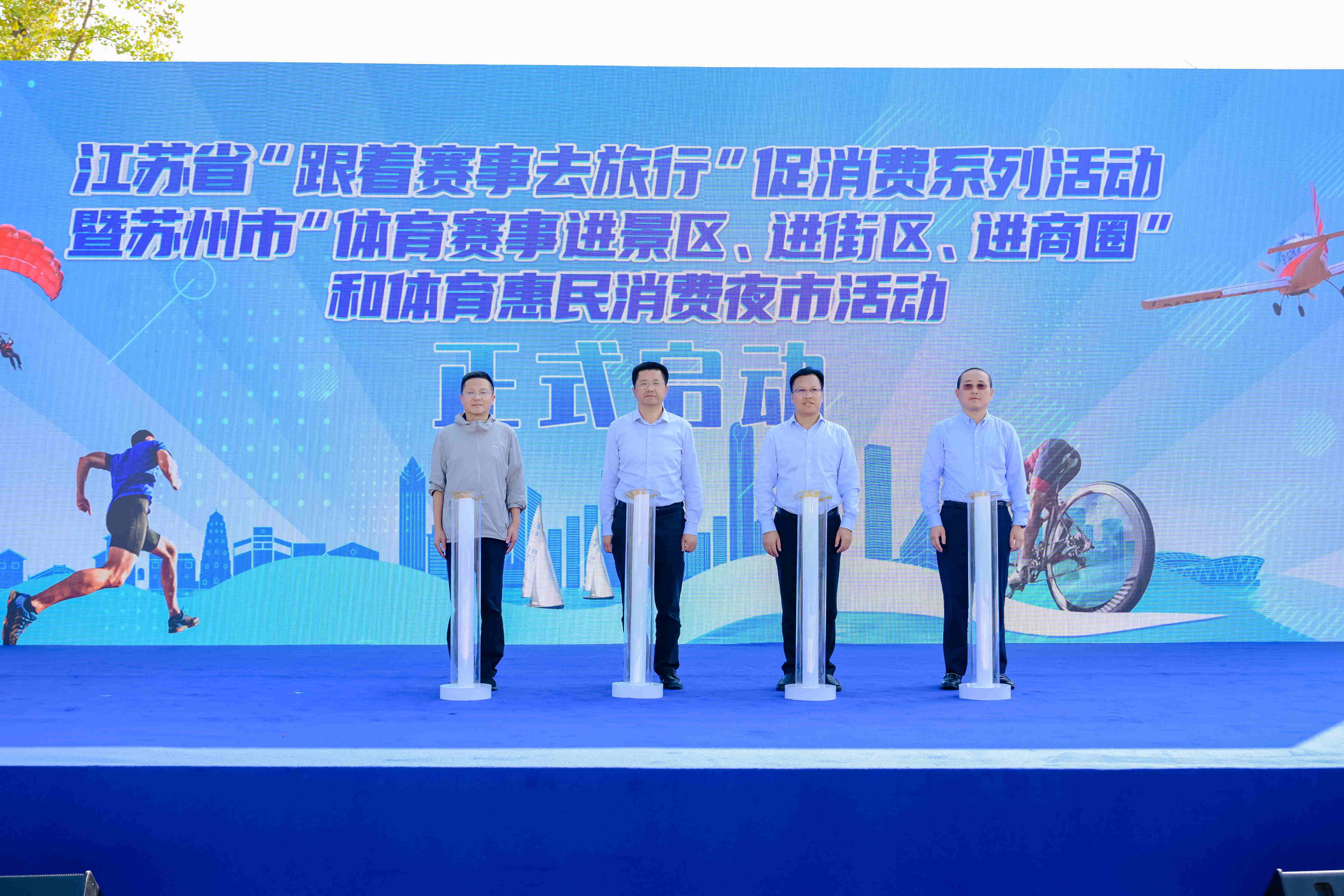 2024年10月11日,江苏省“跟着赛事去旅行”促消费系列活动之苏州大众体育联赛“旱地小铁三”比赛在在苏州国际博览中心举行,江苏省体育局副局长张海涛、江苏省体育局体育经济处处长王峰、苏州市体育局局长阙明清、江苏省体育产业指导中心副主任吴翔共同为活动启幕。