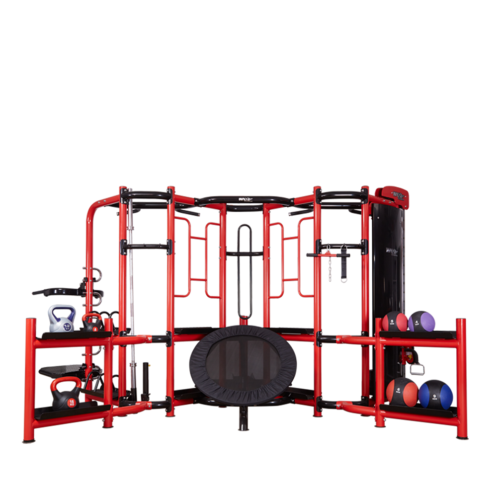 可最少提供9人同时练习,12种以上的练习方式,以下只列出一些常用的练习项目:弹力球运动、踏板运动、单边举重杆、吊绳、壶铃、双杆、甩绳拉力训练、二头肌训练、平拉训练、双杆引体向上等
